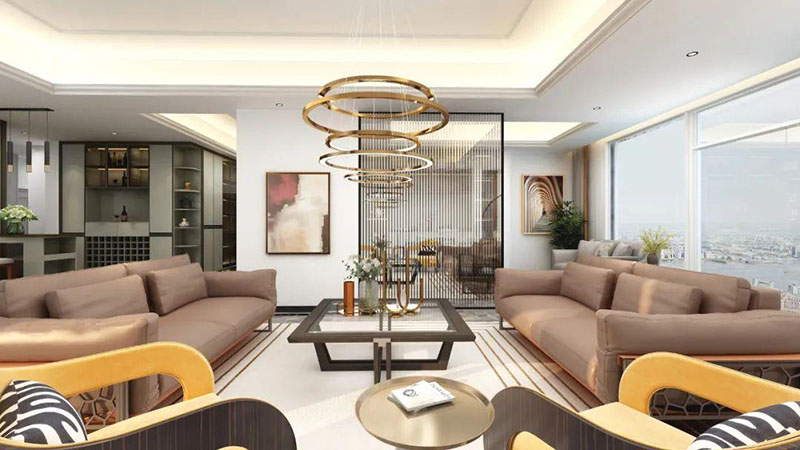 客厅与茶室之间以长虹玻璃隔断,有效的划分功能区,为空间展现一番“犹抱琵琶半遮面”的东方意境美。茶室将意式极简与传统风格糅合,摒弃繁杂、刻板的形式,以含蓄的现代极简诠释着东方美学,展现着传统的待客之道。实木与钨金金属质感碰撞,有棱有角,高级感顷刻得到了升华。